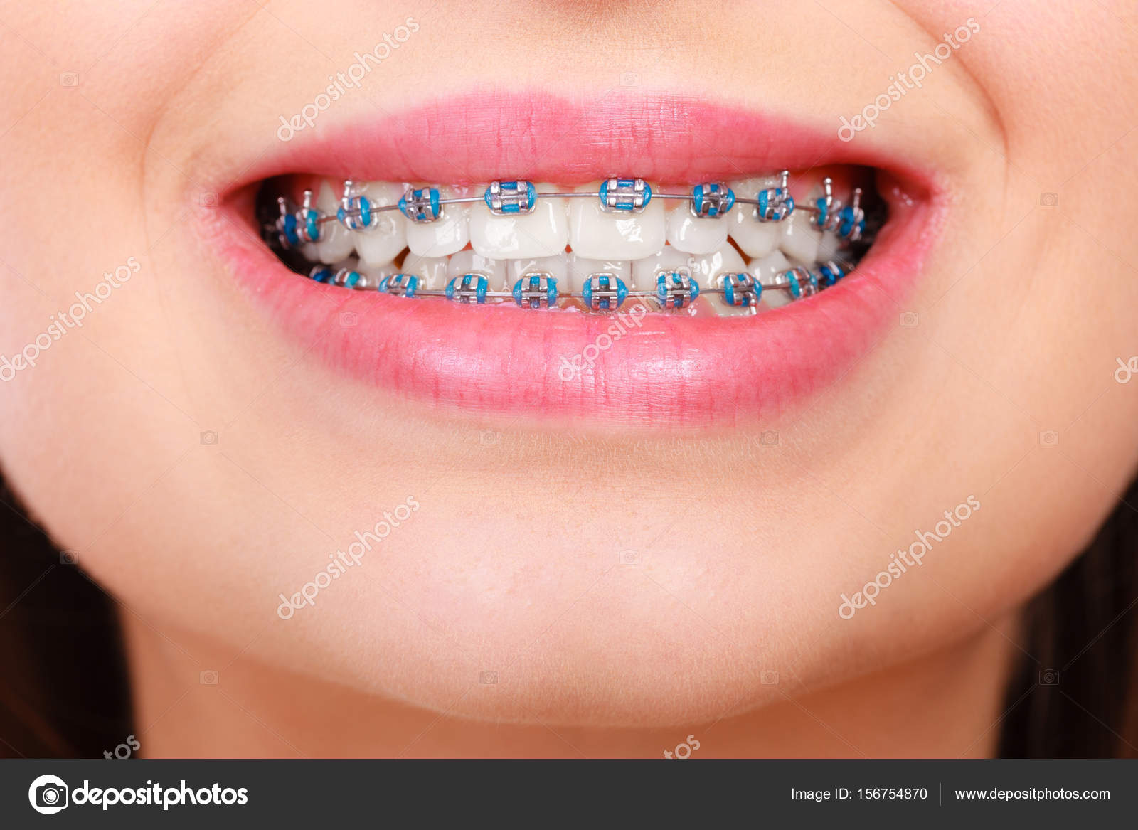 Dentist And Orthodontist Concept Closeup Of Woman Showing Teeth With Blue Braces Stock Photo Picture And Low Budget Royalty Free Image Pic Esy 046753362 Agefotostock